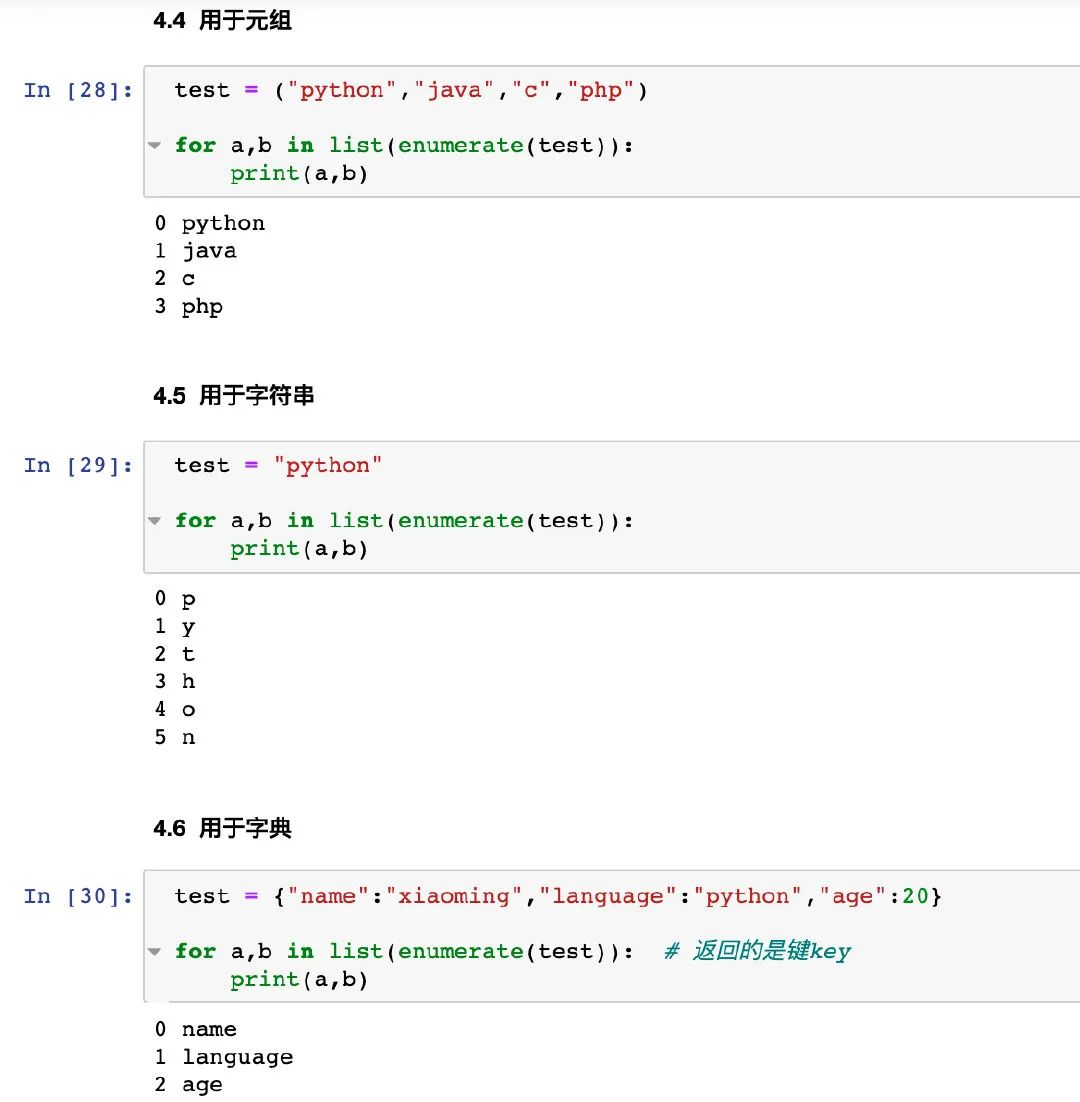 enumerate是 Python的一个重要内置函数,返回的是可迭代序列的元素和下标,对列表、集合、字典、字符串等都适用的。