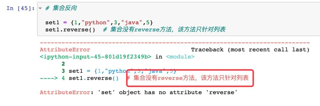 set1.reverse() # 集合没有reverse方法,该方法只针对列表