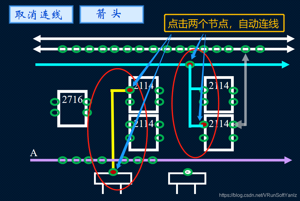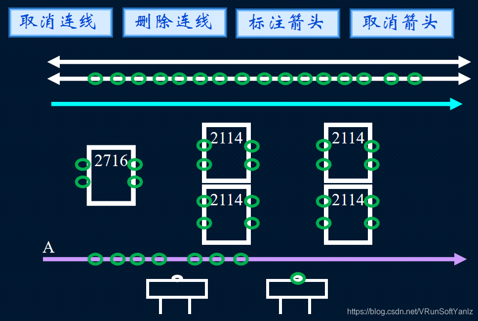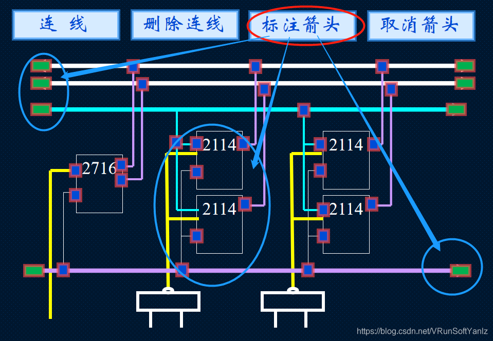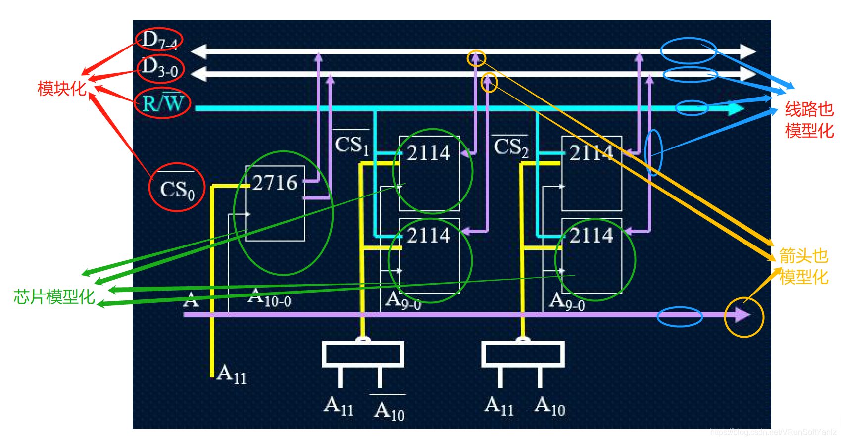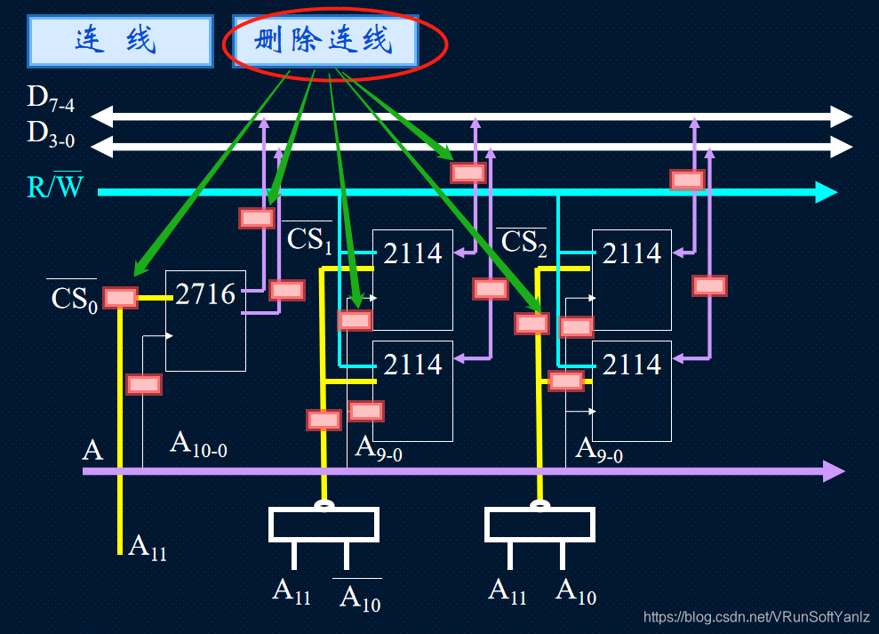 电路中可操作的部分都会被设计成模型,让学生们可以根据需要进行自由设计; 可操作模型包括:各种芯片模型(2716、2114),片选信号模型(CS0、CS1、CS2、A11、A10等),各种连接线(D7-4、D3-0、R/W、其他连线),方向箭头(上下左右),其他可操作的元素模型;