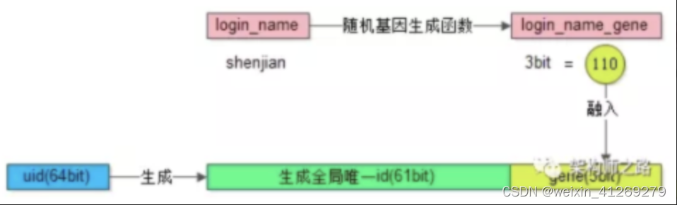 上面的映射关系的方法需要额外存储映射表,按非uid字段查询时,还需要多一次数据库或cache的访问。如果想要消除多余的存储和查询,可以通过f函数取login_name的基因作为uid的分库基因。生成uid时,参考上文所述的分布式唯一ID生成方案,再加上最后3位bit值=f(login_name)。当查询login_name时,只需计算f(login_name)%8的值,就可以定位到具体的库。不过这样需要提前做好容量规划,预估未来几年的数据量需要分多少库,要预留一定bit的分库基因。