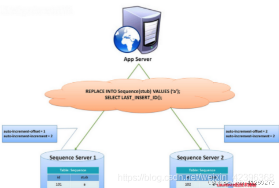 这一方案的整体思想是:建立2个以上的全局ID生成的服务器,每个服务器上只部署一个数据库,每个库有一张sequence表用于记录当前全局ID。表中ID增长的步长是库的数量,起始值依次错开,这样能将ID的生成散列到各个数据库上。如下图所示:
