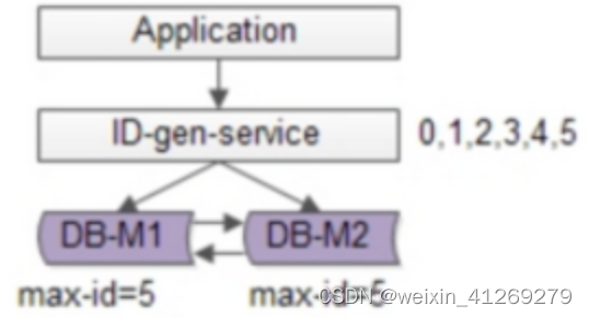 由两个数据库服务器生成ID,设置不同的auto_increment值。第一台sequence的起始值为1,每次步长增长2,另一台的sequence起始值为2,每次步长增长也是2。结果第一台生成的ID都是奇数(1, 3, 5, 7 …),第二台生成的ID都是偶数(2, 4, 6, 8 …)。