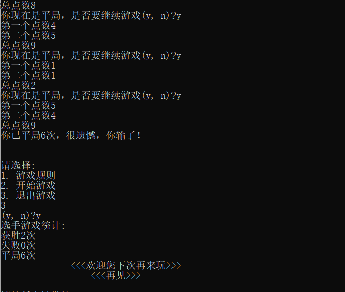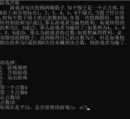 5.选择2开始游戏,当遇到平局时,提示是否继续游戏。