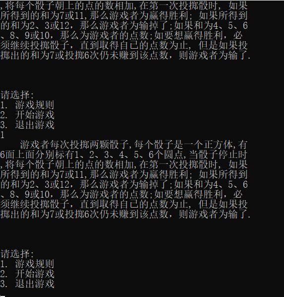 先建立类DiceGame的对象objGame并调用类DiceGame的构造函数,为类的数据成员赋初值并开始游戏,再用对象objGame访问类的成员函数Game(),进入游戏,通过选项玩家选择进入游戏或退出游戏。在函数Game()中,先调用Help()函数显示游戏规则,并调用Rand类中SetRandSeed()函数设定当前时间为随机数种子,进入while循环中,显示游戏选项,玩家可选择1.获得帮助。 然后调用成员函数Help()显示提示;2.开始游戏。 然后调用成员函数RollDice(),把随机的两个骰子的点数赋值给整形数sum,通过switch()语句判断玩家输、赢或者平局。若玩家第一盘为平局状态为TIE,则该局骰子和为玩家的点数把sum赋值给myPoint通过调用UserSaysYes()函数选择继续投骰子,直到赚到该点数时获胜状态为WIN,但是用if语句判断如果投掷出的和为7或者连续投掷出六次平局,则游戏者该局为输了LOSE。最后用while循环中的if语句为每一次输赢和平局计数并显示玩家的输赢的语句。3.退出游戏 。然后调用UserSaysYes()函数让玩家确定是否退出,退出后通过调用成员函数Show()显示游戏结果,游戏结束!