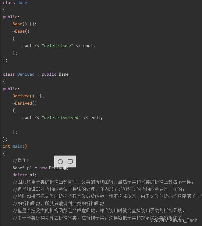 - 在用基类操作派生类时,为了防止执行基类的析构函数,不执行派生类的析构函数。因为这样的删除只能够删除基类对象, 而不能删除子类对象, 形成了删除一半形象, 会造成内存泄漏.