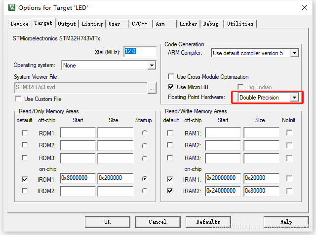 1、打开FPU,需要在编译器的Options中配置相关参数。因为STM32H7系列是双精度的FPU,所以这里选择Double Precision。