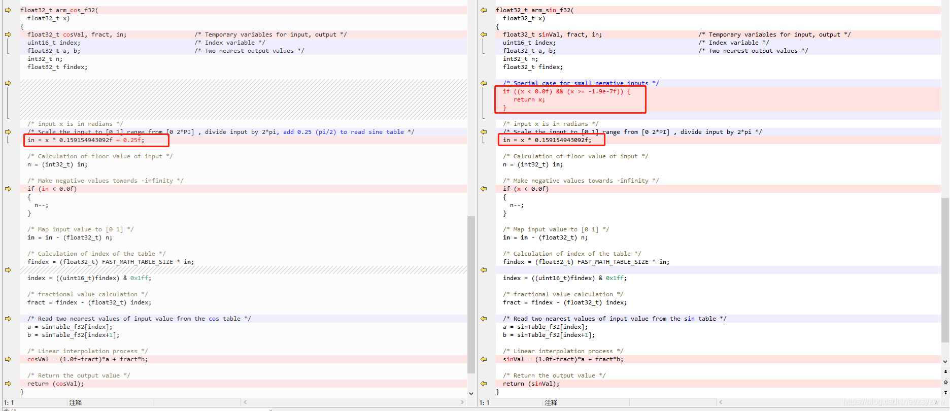 为什么arm_sin_f32比arm_cos_f32快呢?贴出源码对比分析一下,发现arm_sin_f32比arm_cos_f32多一个判断语句,少一个加法运算。这样就可以解释的通了!