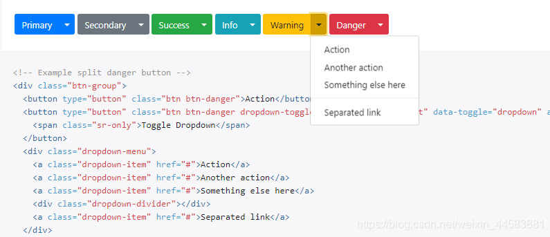 (2)分裂式按钮下拉菜单:利用单个按钮下拉菜单近似的标记创建分裂式下拉菜单,注意添加了dropdowm-toggle-split插入此符号为下拉选项作适当的间隔处理,我们使用这个额外的class样式,将插入符号两边水平padding减少了25%,并移除了为默认下拉菜单添加的margin-left属性,这些额外的更改将插入符号集中在分裂式按钮中,并在主按钮中,并在主按钮旁边提供了适合的点击空间