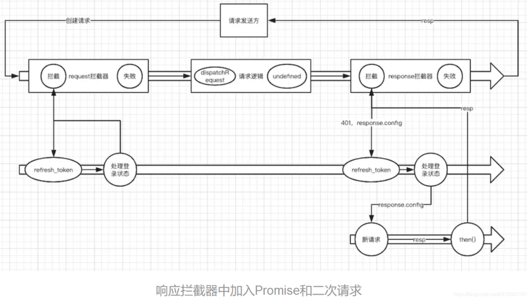 我们需要在前端请求后拦截返回的401错误,然后自己新建一个请求来使用refresh_token 重新生成access_token的代码如下:
