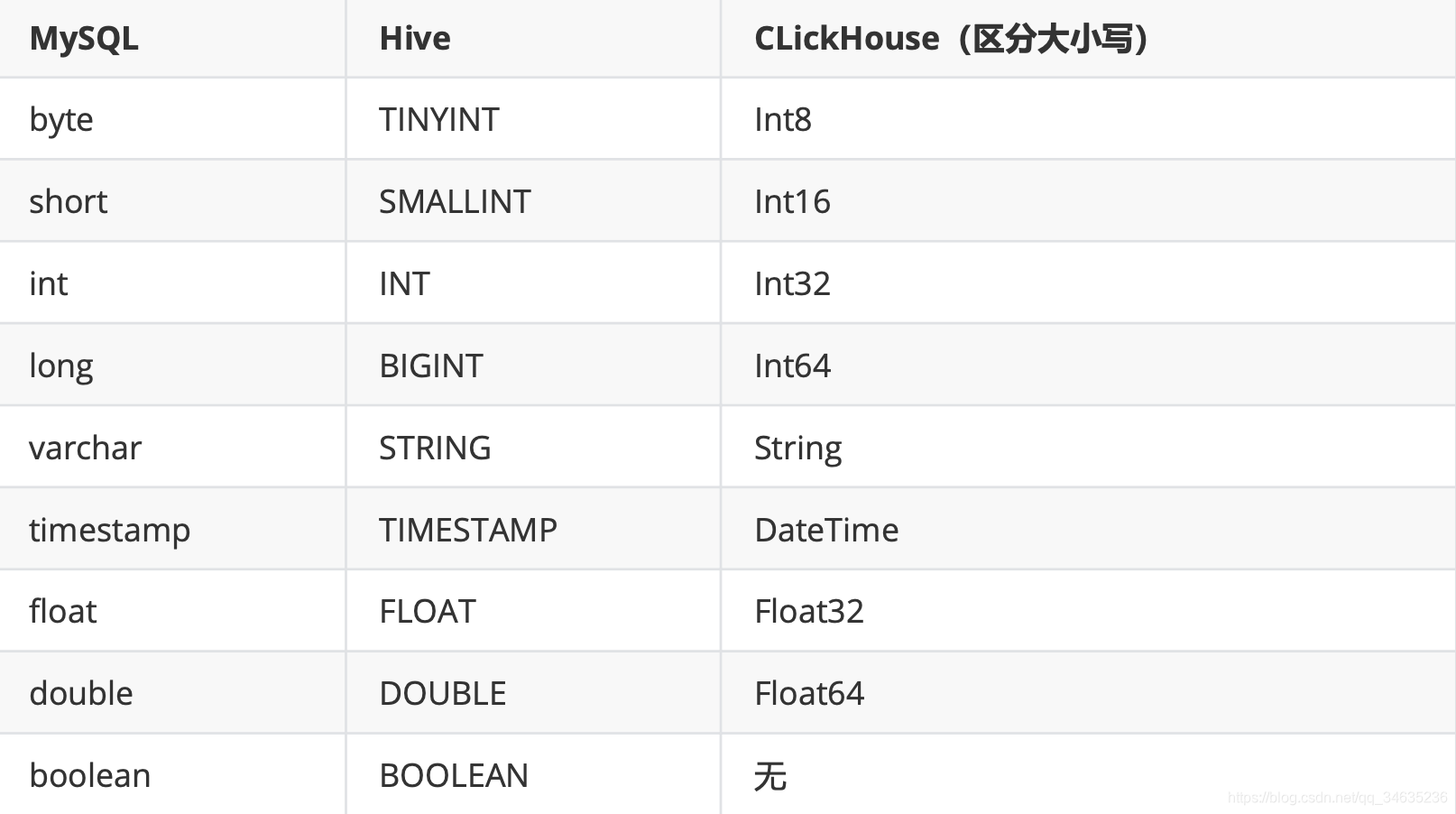 基础类型只有数值、字符串和时间三种类型,没有 Boolean 类型,但可以使用整型的 0 或 1 替代。 ClickHouse 的数据类型和常见的其他存储系统的数据类型对比: