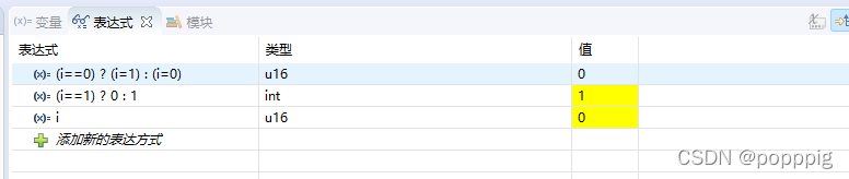 - 假如我们对于这行代码中 (i==0) ? (i=1) : (i=0) 这个表达式的值不理解时,我们可以通过选择 窗口-显示视图-表达式打开表达式窗口,并将代码中 (i==0) ? (i=1) : (i=0) 添加到窗口,观察该表达式的值。