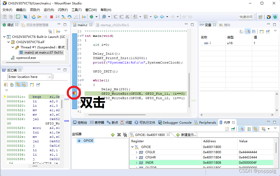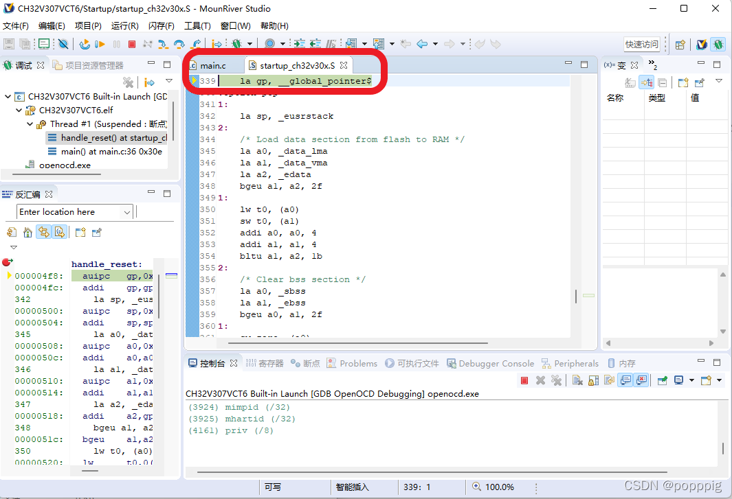 成功进入Debug模式之后,MRS将进入Debug界面。在该界面下,程序指针将跳转到启动代码的第一行,等待运行。