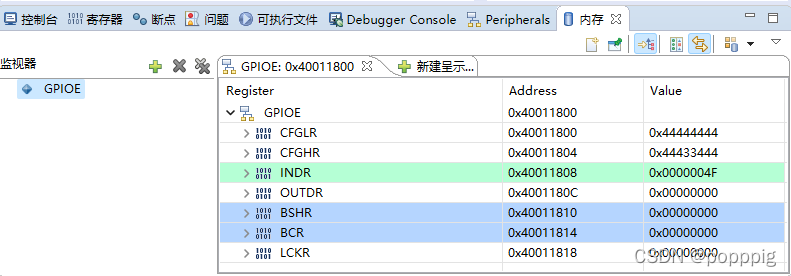 即可在内存窗口中观察GPIOE相应的寄存器现在的状态。