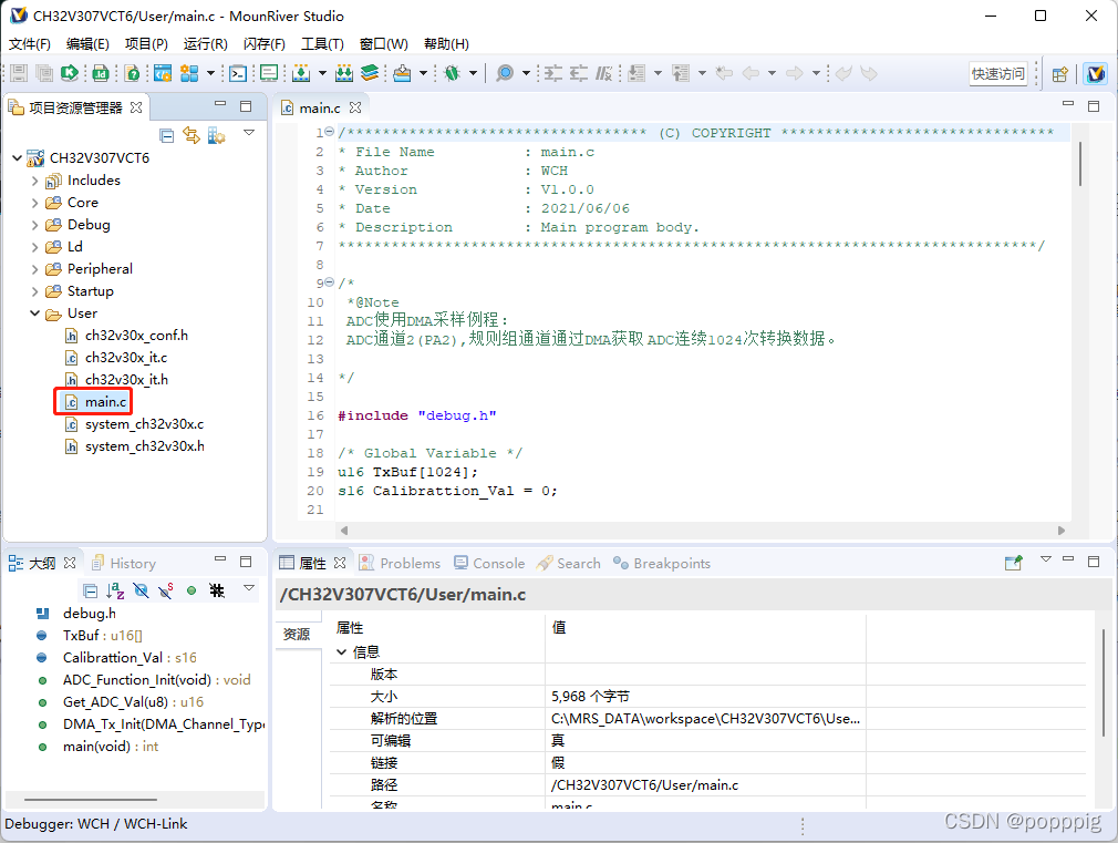 此时 main.c中为MRS使用AD的样例模板生成的工程文件。