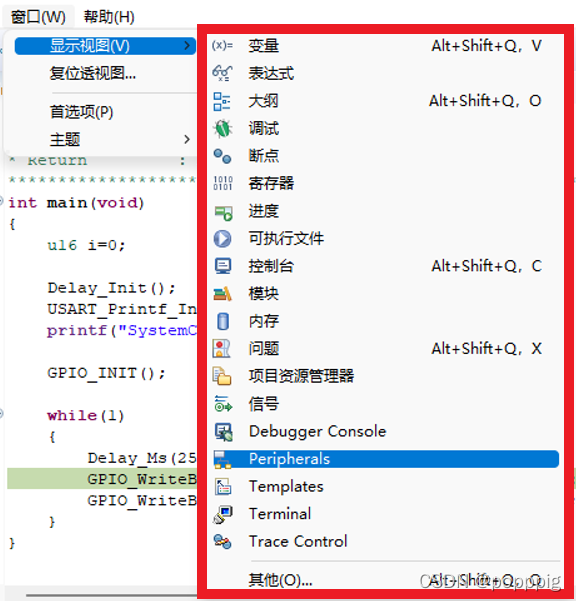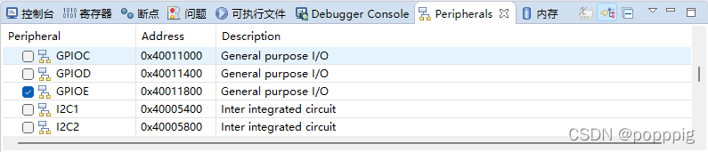 - 假如我们需要观察 GPIOE 相关寄存器的状态。选择外设(Perpherals) ,在里面找到GPIOE,勾选上。