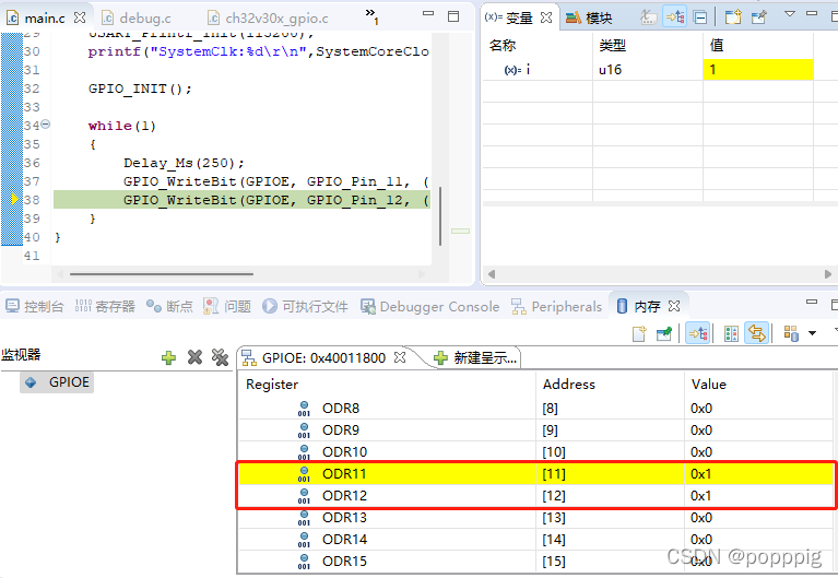 展开OUTDR,该寄存器是控制端口输出值,点击运行,每次运行后发现ODR11,ODR12会交替变为0、1。它们分别对应了GPIOE11和E12的输出值。