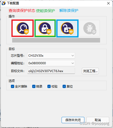 在下载配置菜单下,可以配置下载的芯片型号、编程地址、目标文件,还可以对芯片的读保护进行加密和解密操作。对于下载的过程可以选择全片擦除、校验、复位(复位勾选即表示在下载完成后芯片会自动复位)。