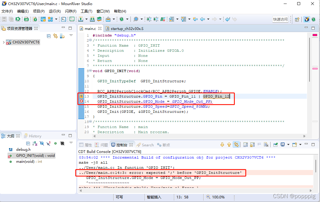 第一步:将AD相关代码删除,添加GPIO口初始化函数,配置PE11和PE12为输出端口。