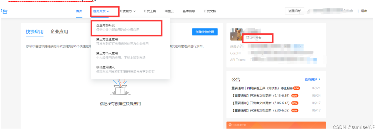 有了管理员权限之后,我们可以登录开发者后台,开发者后台中可以选择你要开发的类型。我们选择是是企业内部应用开发。