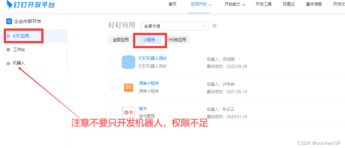 在开发的过程中,如果直接开发的是机器人,将会有好多权限问题,钉钉给机器人类型的开发权限有些不足,所以后期我进行的是小程序开发,小程序开发的话,权限齐全,我们只需要在小程序开发的过程中申请一个机器人即可,此机器人也是支持回调的。
