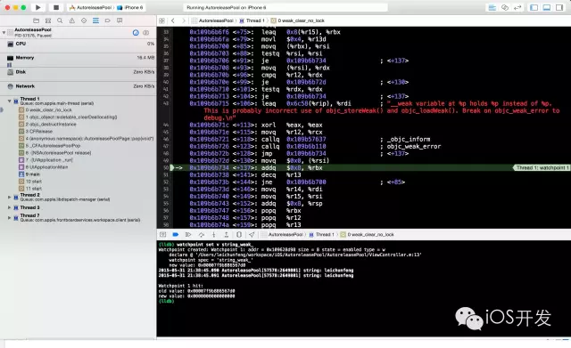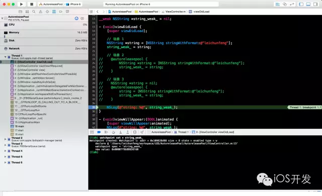 在开始前,我先简单地说明一下原理,我们可以通过使用 lldb 的 watchpoint 命令来设置观察点,观察全局变量 string_weak_ 的值的变化,string_weak_ 变量保存的就是我们创建的 autoreleased 对象的地址。在这里,我们再次利用了 __weak 变量的另外一个特性,就是当它所指向的对象被释放时,__weak 变量的值会被置为 nil 。了解了基本原理后,我们开始验证上面的猜测。