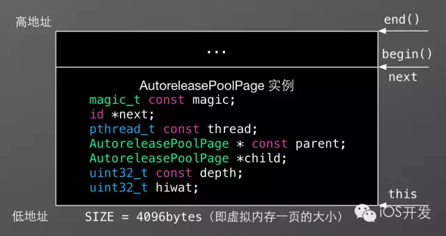 另外,当 next == begin() 时,表示 AutoreleasePoolPage 为空;当 next == end() 时,表示 AutoreleasePoolPage 已满。