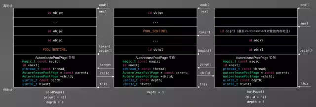 magic用来校验 AutoreleasePoolPage 的结构是否完整;next指向最新添加的 autoreleased 对象的下一个位置,初始化时指向begin();thread指向当前线程;parent指向父结点,第一个结点的 parent 值为nil;child指向子结点,最后一个结点的 child 值为nil;depth代表深度,从 0 开始,往后递增 1;hiwat代表 high water mark 。