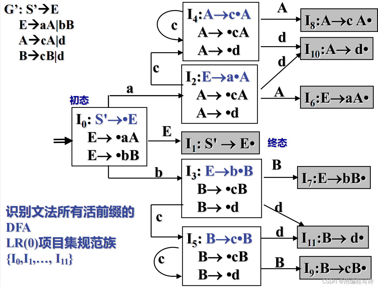 求出文法的所有项目,按一定规则构造识别活前缀 的 NFA, 再确定化为 DFA 确定化的 工作量较大 ,而且 容易出错 , 实际应用中并不使用 ,这 里介绍的目的仅仅是为了 便于理解。具体见 识别活前缀的有限自动机构建方法_用编程写诗的博客-CSDN博客