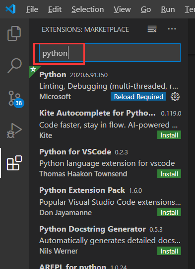 2.搜索python,就可以看到第一个python插件了,然后点击右下角的install就可以了(我是安装过了,所以右下角显示的是reload required),之后我的后台代码就可以正常跳转了:
