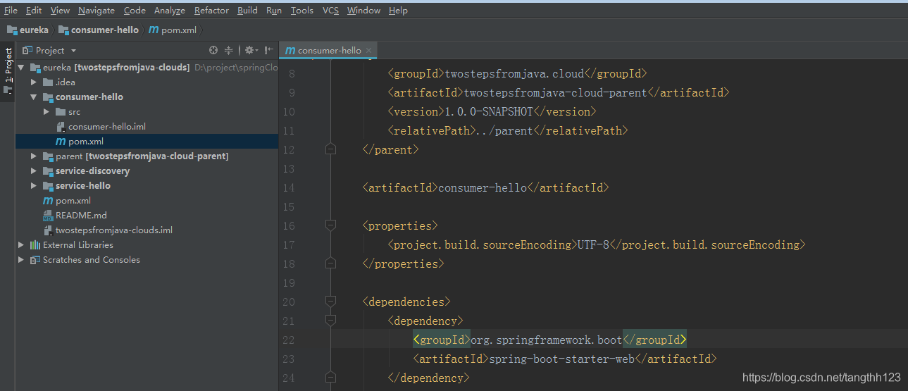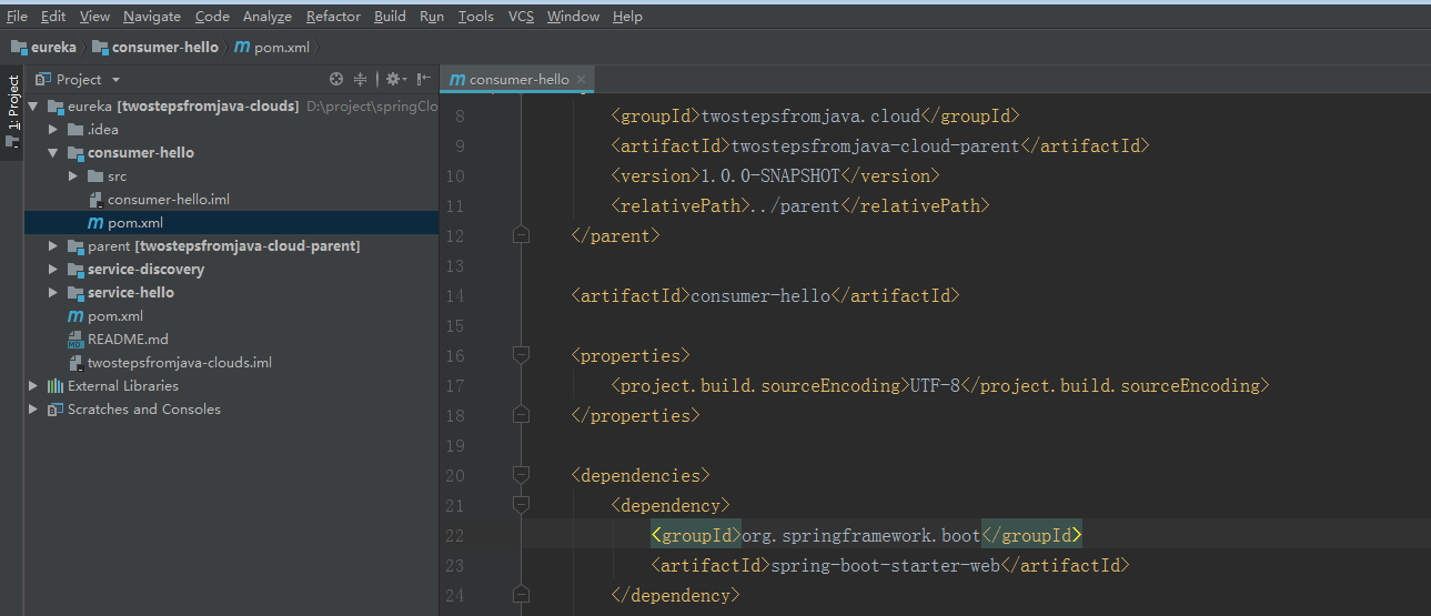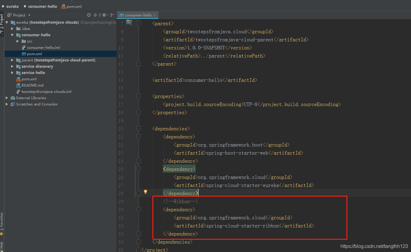 (2)在我们的consumer-hello中(服务消费方)的pom中引入依赖文件