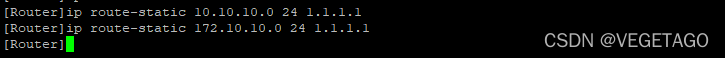注:默认路由是上访问外网的关键,交换机本地如果收到主机请求的数据包,但是本地没有查找到目的地址,则需要默认路由把数据包抛给其他设备(这里是路由器)路由器在收到外部目的地址指向内网IP时再抛给三层交换机。