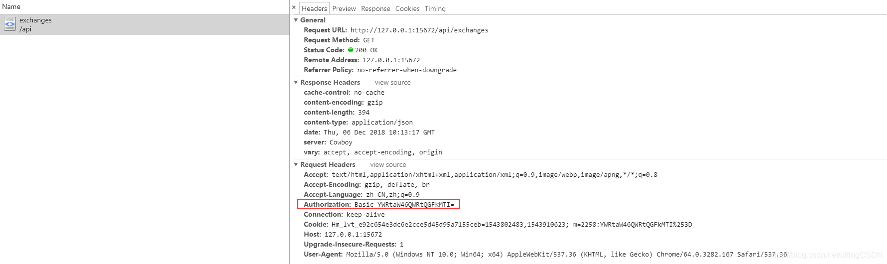 如图所示发现原来如果要用HTTP的API获得RabbitMQ的交换机、队列等信息时,系统要求使用Basic的HTTP的认证方式。