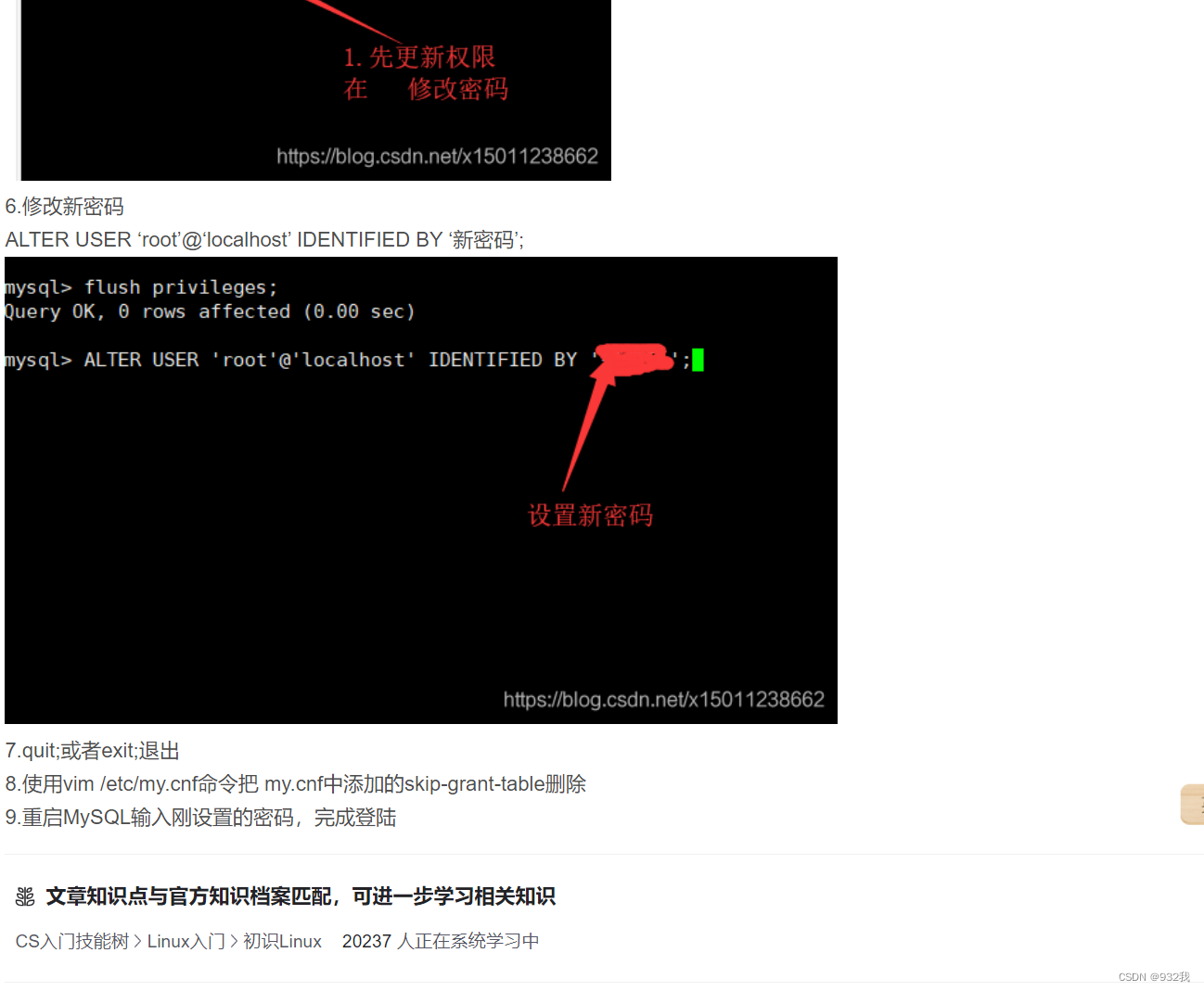 Mysql修改密码 5.flush privileges;(首先更新权限) 版权声明:本文为qq_57283958原创文章,遵循CC 4.0 BY-SA版权协议,转载请附上原文出处链接和本声明。原文链接:https://blog.csdn.net/qq_57283958/article/details/127470007