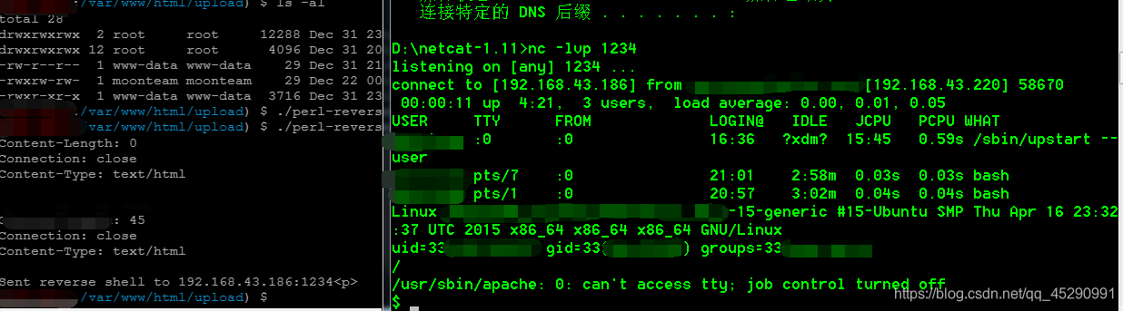 这一步可以用很多方法,只要能够建立一个连接都可以,具体的方法我们可以百度,比如nc.exe发送一个bash shell,木马,上传一个 perl-reverse-shell.pl 建立 sockets……