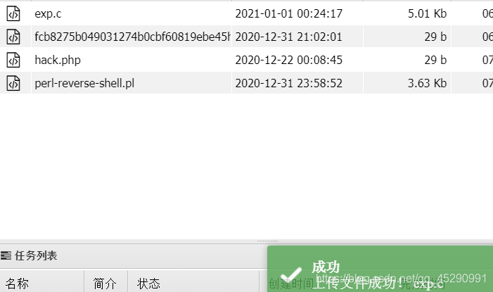 这里我用的方法是上传一个 perl-reverse-shell.pl 建立 sockets……,怎么上传呢?这里我们默认已经用中国蚁剑或者菜刀连接到shell了,就直接上传文件就可以。一般来说,Linux下默认tmp文件夹具备执行权限和写入权限,但是第一次我上传文件失败,打开靶机发现是我不具备写入tmp文件夹的权限,我只有写入upload文件夹的权限,那就只好把 perl-reverse-shell.pl 文件传到upload文件夹里面了。