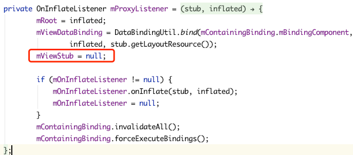 这里要注意 viewstub 在 inflate 后会变为真正的 view,原来的 viewstub 会变为 null 所以不能重复 inflate。