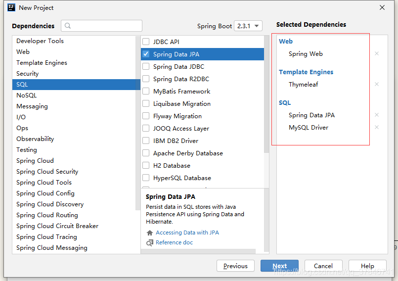 我选了Web下的Spring Web、Template Engines下的Thymeleaf和SQL下的Spring Data JPA以及MySQL Driver