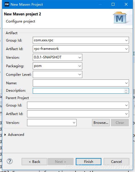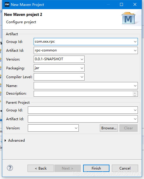 这里要注意的是,因为该工程为引用的父类工程,所以打包类型选择为“pom”类型。