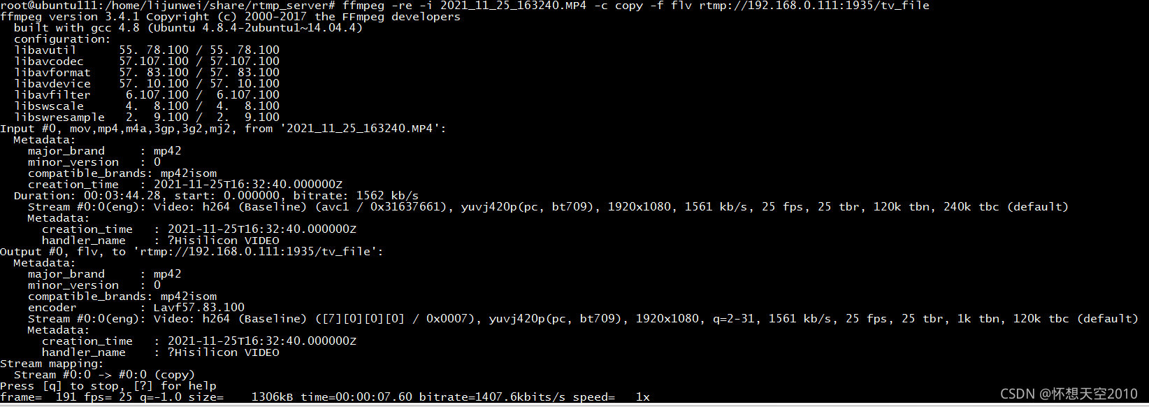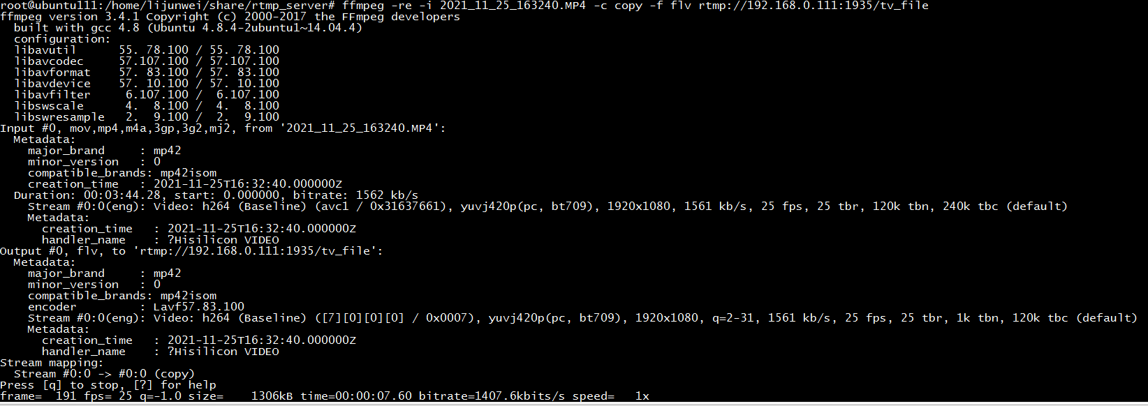 #ffmpeg -re -i 2021_11_25_163240.MP4 -c copy -f flv rtmp://192.168.0.111:1935/livestream