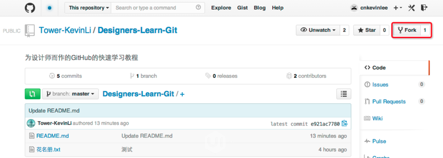 点这里打开我用马甲专为本教程建立一个库 Designers-Learn-Git,可以看到创建者名(我的马甲)写在/前面:Tower-KevinLi。然后点击右上角的Fork按钮。