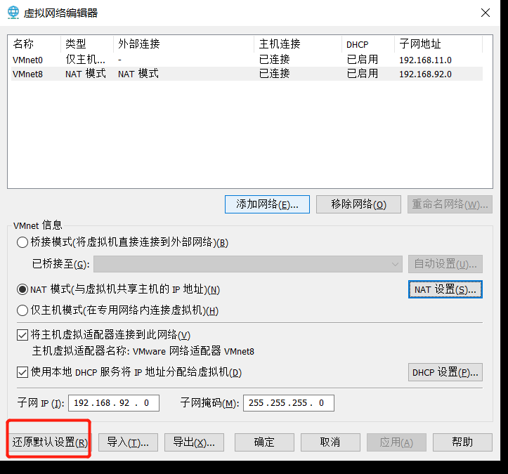 2、还原网卡默认配置(不建议,血泪1),VMnet8 、VMnet0配置经验