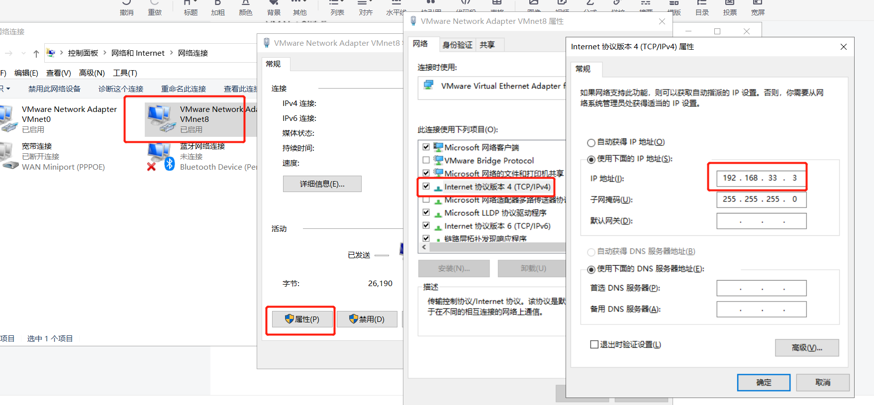 联通的方式肯定是:虚拟机的Vmnet8IP网段=虚拟机的IP网段=主机的Vmnet8IP网段,且IP各不相等。