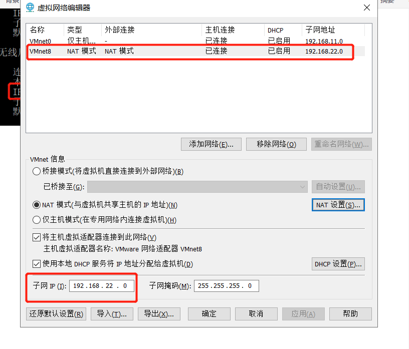 虚拟机ping主机不通,查看NAT模式中VMnet8网卡的子网地址,在网段192.168.22