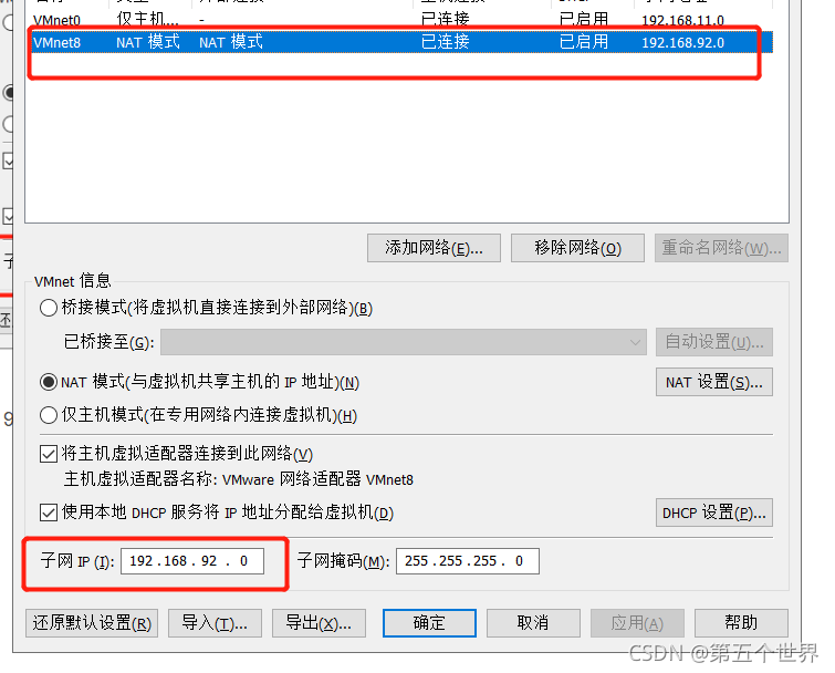 总结:虚拟机ping主机不通,是虚拟机的Vmnet8 (不同于主机Vmnet8)网卡IP网段(此示例192.168.22)与虚拟机IP网段(此示例192.168.92)不在一个网段上,所以必须保持一致,这样才能连上外网。注意一定不能将虚拟机的Vmnet8网卡IP与虚拟机IP设置成一致,否则IP冲突。