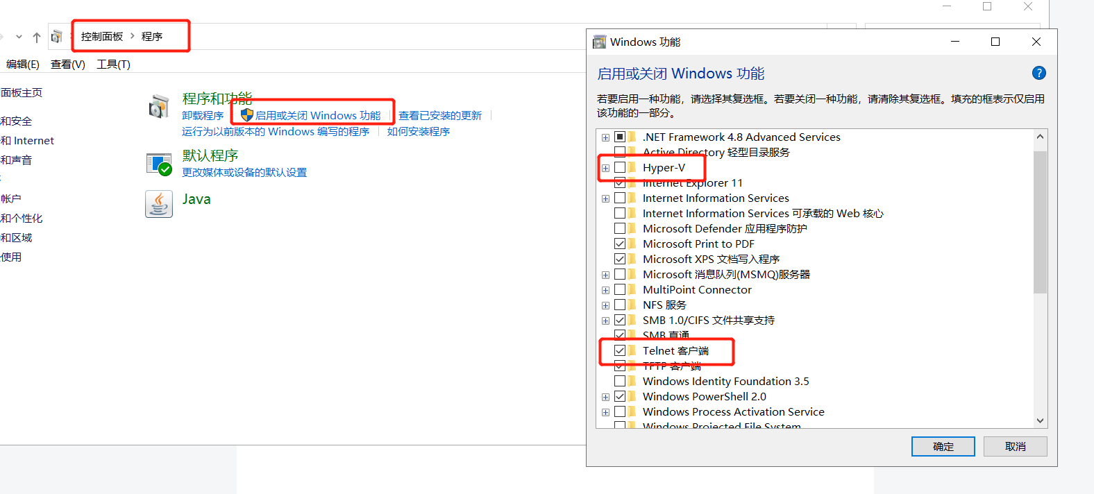 我就又网上找了一堆方案,说我telnet客户端没开启,我是开启着的,也有说是window自带Hyper-V虚拟服务的干扰,我没有勾选。