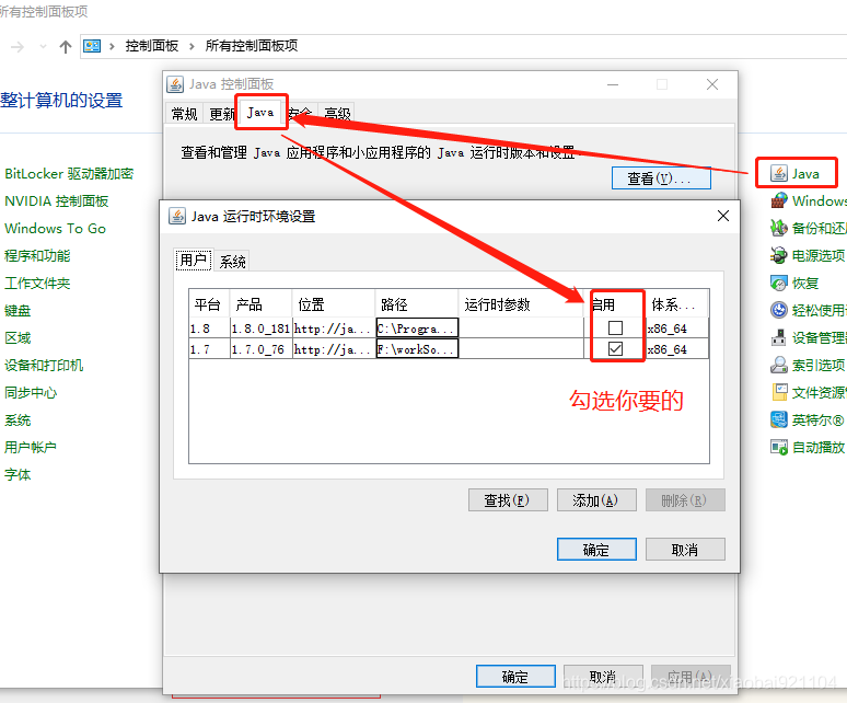 2、找到控制面板,查看方式选择大图标或者小图标,找到 java选项 并点击进入(注意:该java选项只有在独立安装了jre后才有)。 然后选择java栏,点击查看,将 1.8、9 的启用勾选去掉,并保存。然后重新打开cmd,进入多个目录下,输入命令:java -version 查看是否切换成功。