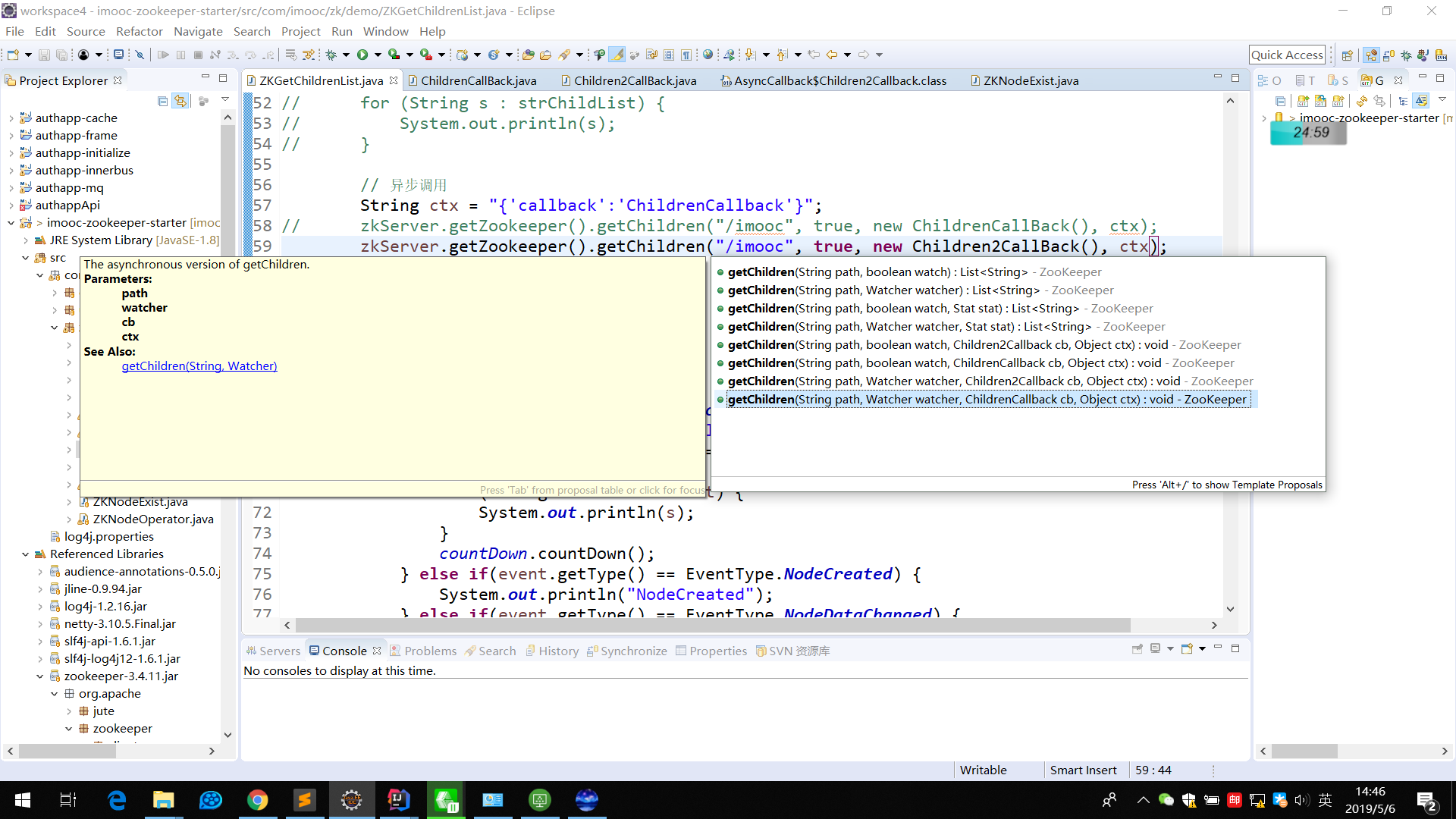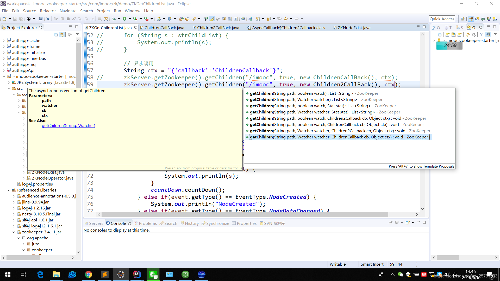 很明显是创建了一个匿名的内部类的方式实现的,该匿名类实现了StringCallback接口,并重写了接口的processResult方法,整个异步回调机制类似watcher机制,都是客户端向服务端发送请求后不阻塞客户端线程,继续往后面执行代码,等服务端执行完客户端的请求后再往客户端发送执行结果,客户端通过非阻塞io发现可读事件,并把可读的执行结果写入waitingEvents队列,以便eventThread线程轮询调用相关的StringCallback对象的processResult方法
