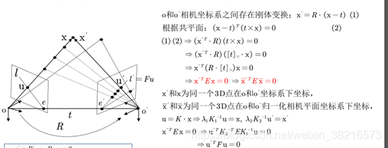 像点的极线约束方程说明了极线的求法,左像平面上的点乘上F是右像平面过像点的极线,l=u叉乘e,点叉乘点代表经过这两点的直线