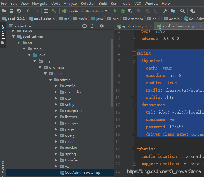 soul-2.2.1\soul-admin\src\main\resources下的配置文件application-local.yml,将其中的mysql配置修改为自己环境中搭建的mysql配置,如笔者搭建的mysql配置如下: