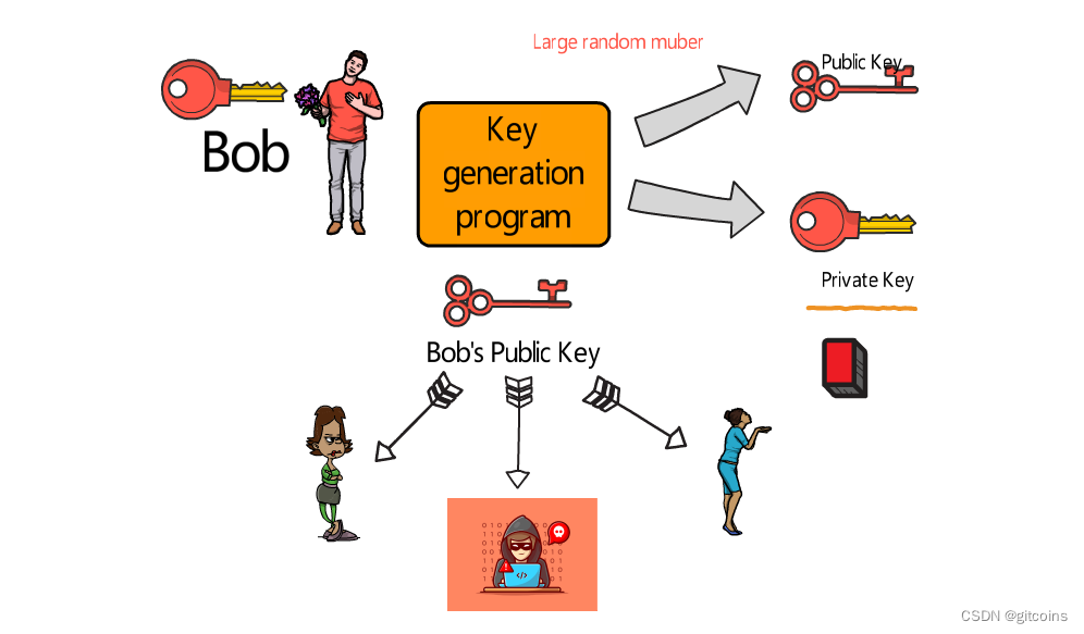 我们用红色表示Bob的秘钥对因为常见秘钥需要一个特别大的随机数,所以Alice和Bob他们的公钥不相同,他们的私钥也不相同。